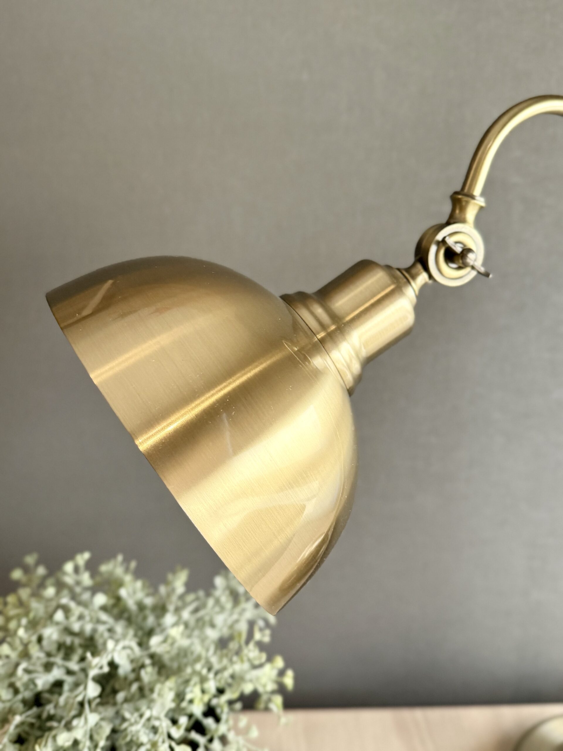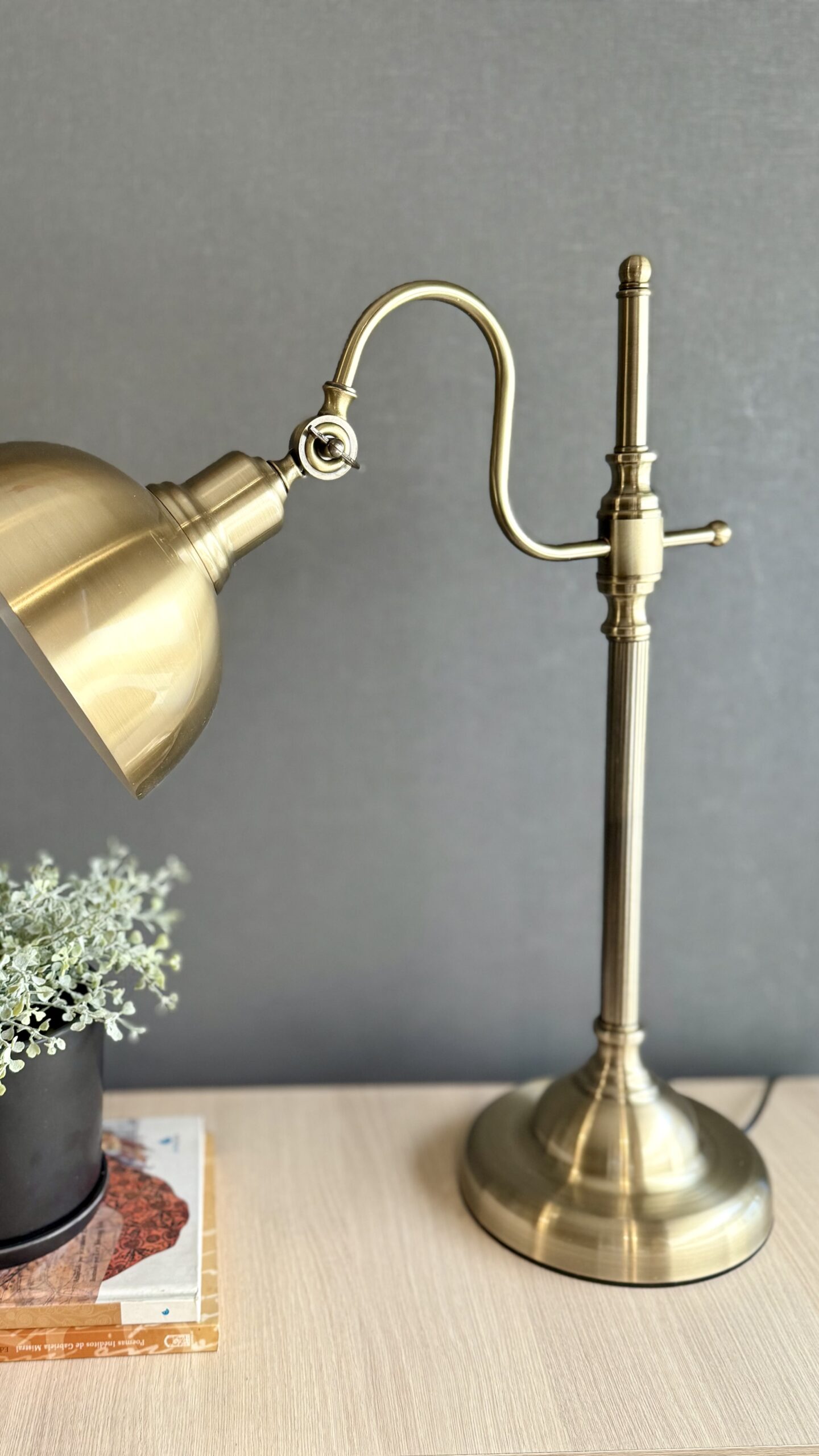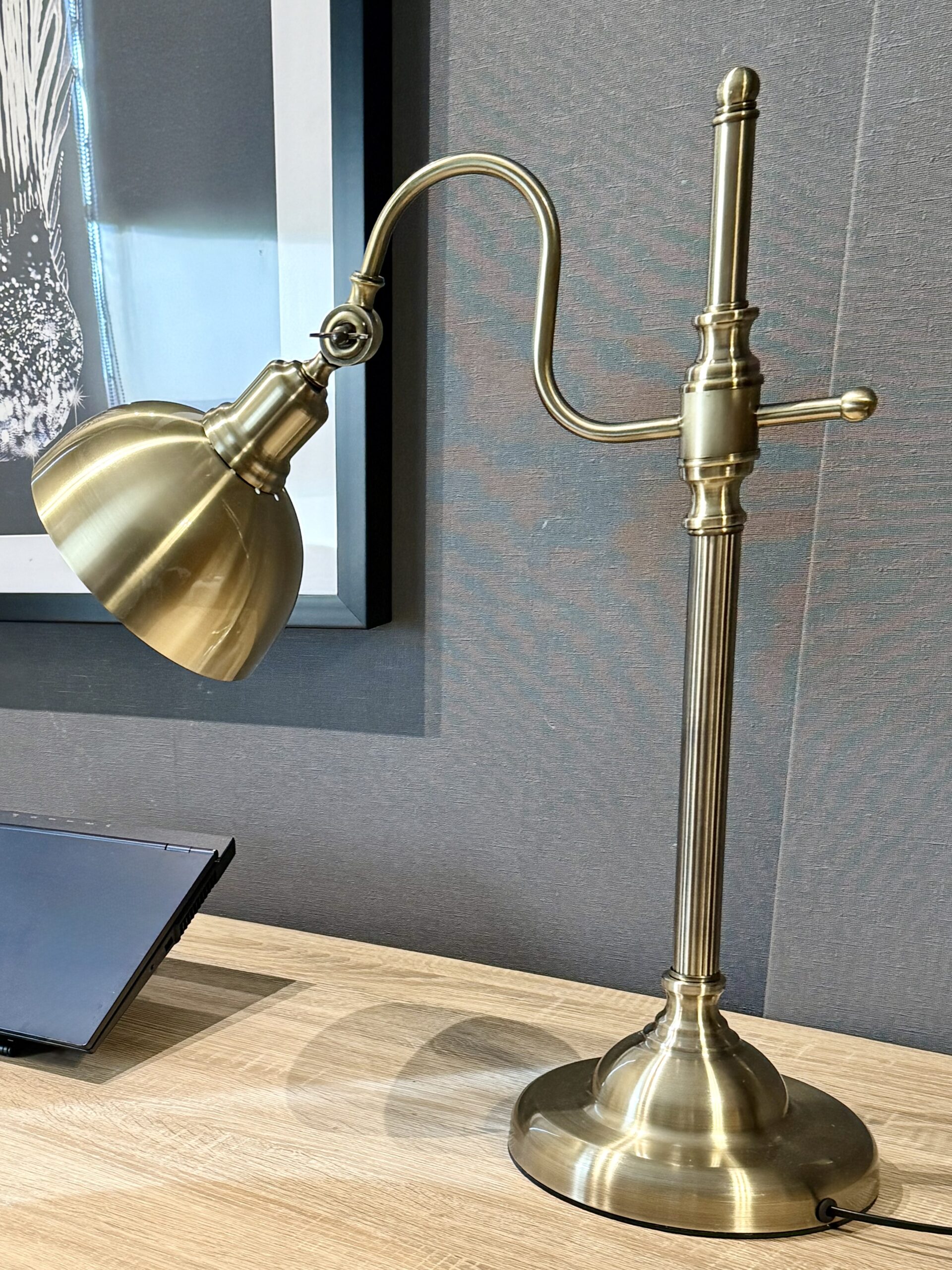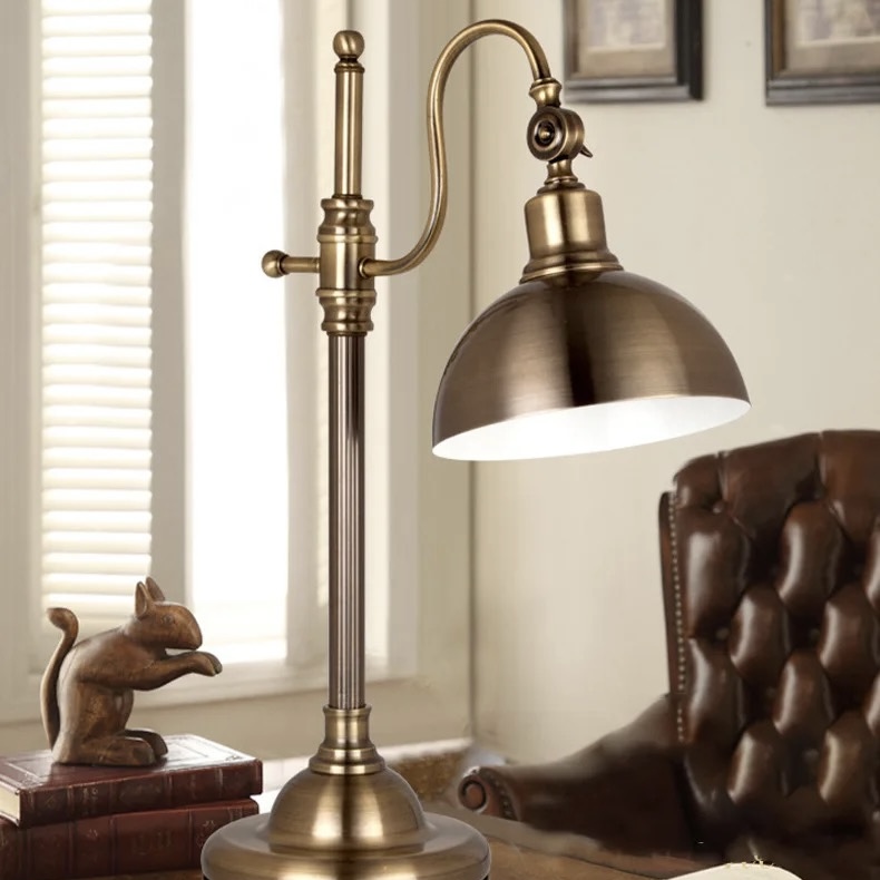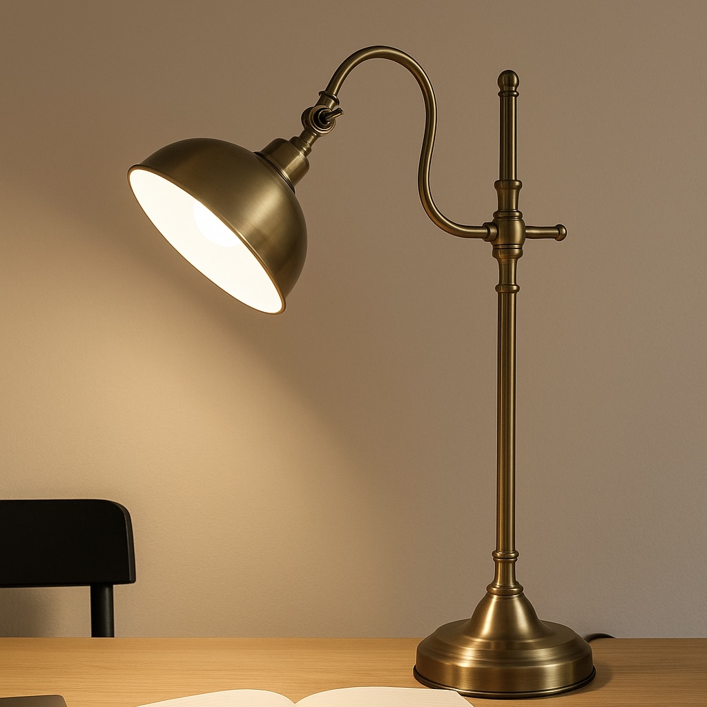 La lámpara es de estilo vintage con un acabado en bronce envejecido. Tiene una base redonda y robusta, un soporte vertical largo y un brazo ajustable que permite cambiar la posición de la pantalla. La pantalla es metálica y redondeada, diseñada para dirigir la luz proporcionando una iluminación focalizada ideal para escritorio o lectura. Su diseño y color le dan un aire clásico y elegante, perfecto para ambientes de oficina o biblioteca.